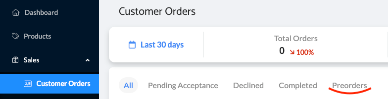 You can also filter these preorder products in "Customer orders" on the left panel in StockShare, and then locate "Preorders" on the far right as seen below:
