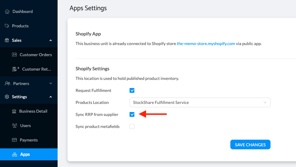 As the retailer, you can choose whether or not your supplier’s RRP changes automatically sync into your StockShare. To select which option, navigate to your "Settings" on the left panel in your dashboard and click on "Apps".