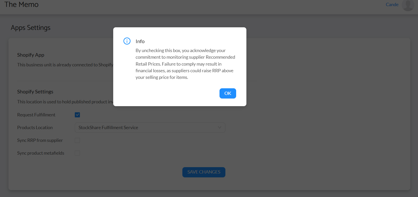 4. The update of suppliers RRP in Shopify will update the Stockshare Supplier RRP, however this will not update on the Retailer RRP if it remains unchecked as suppliers are generally connected to multiple retailers with different agreed structures.