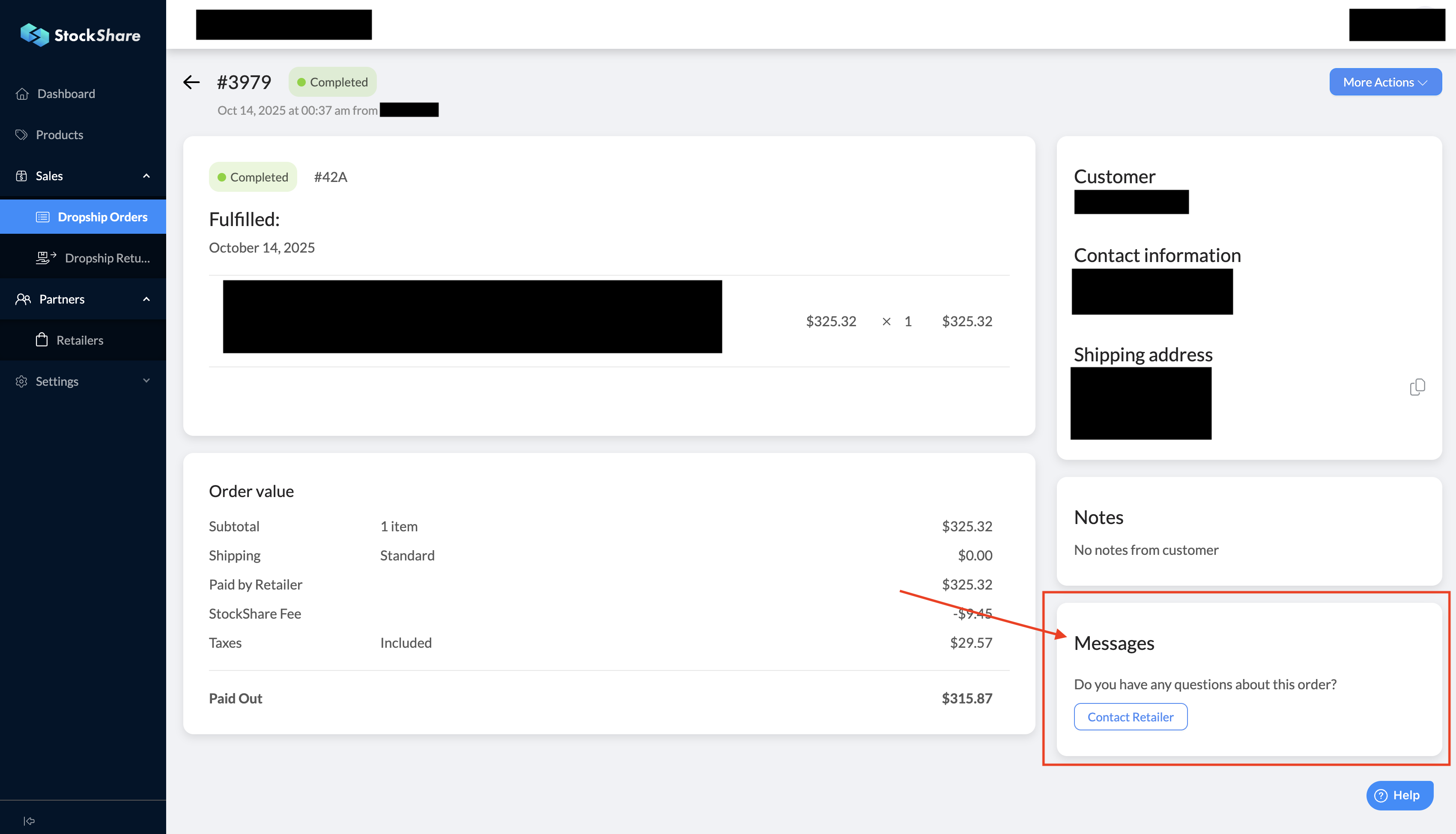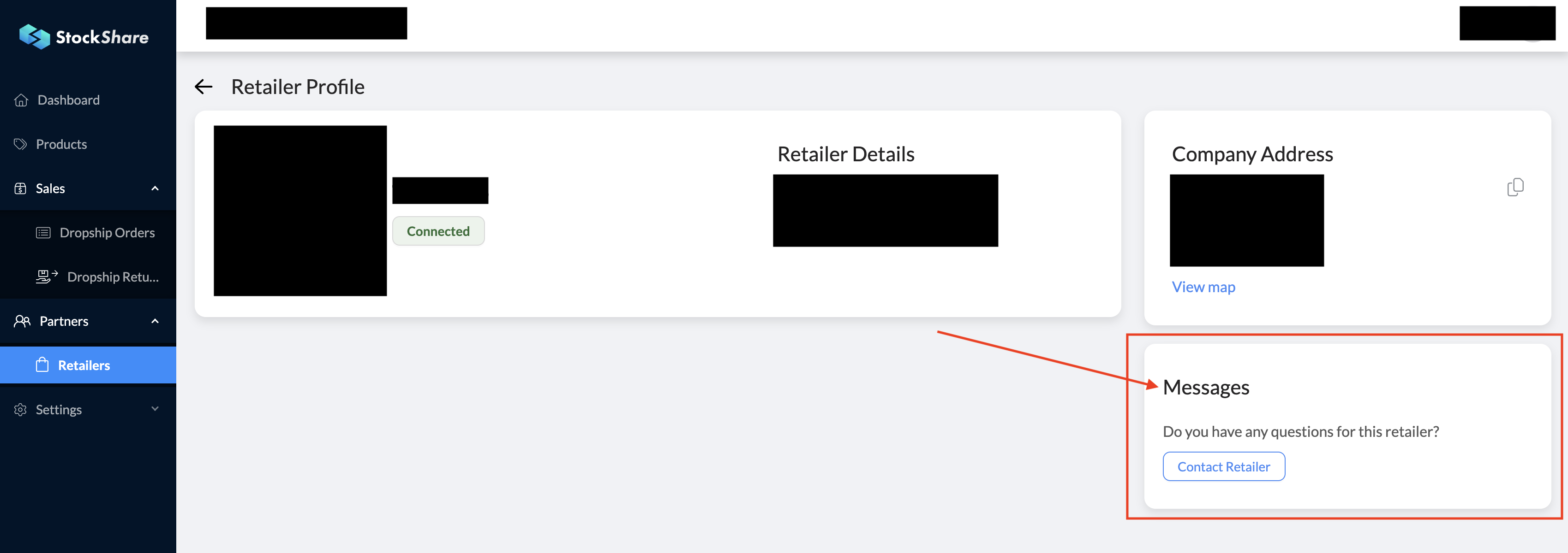 You can reach out to a supplier or retailer about an order by clicking “Contact Supplier” or “Contact Retailer” under the Messages section on the order detail page.
