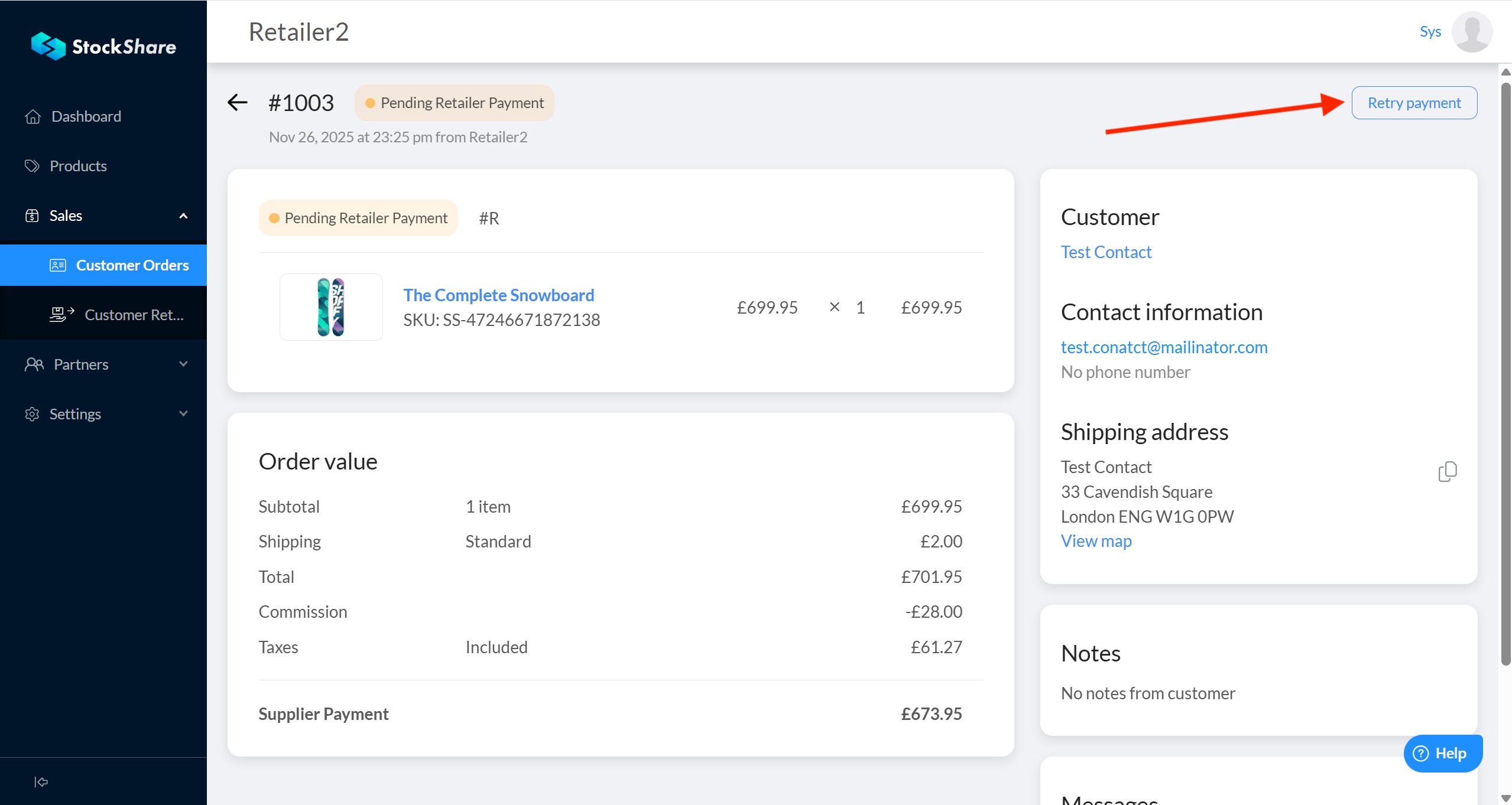 - If the order has failed to take Retailer payment, there will be a button on the order page to retry payment: