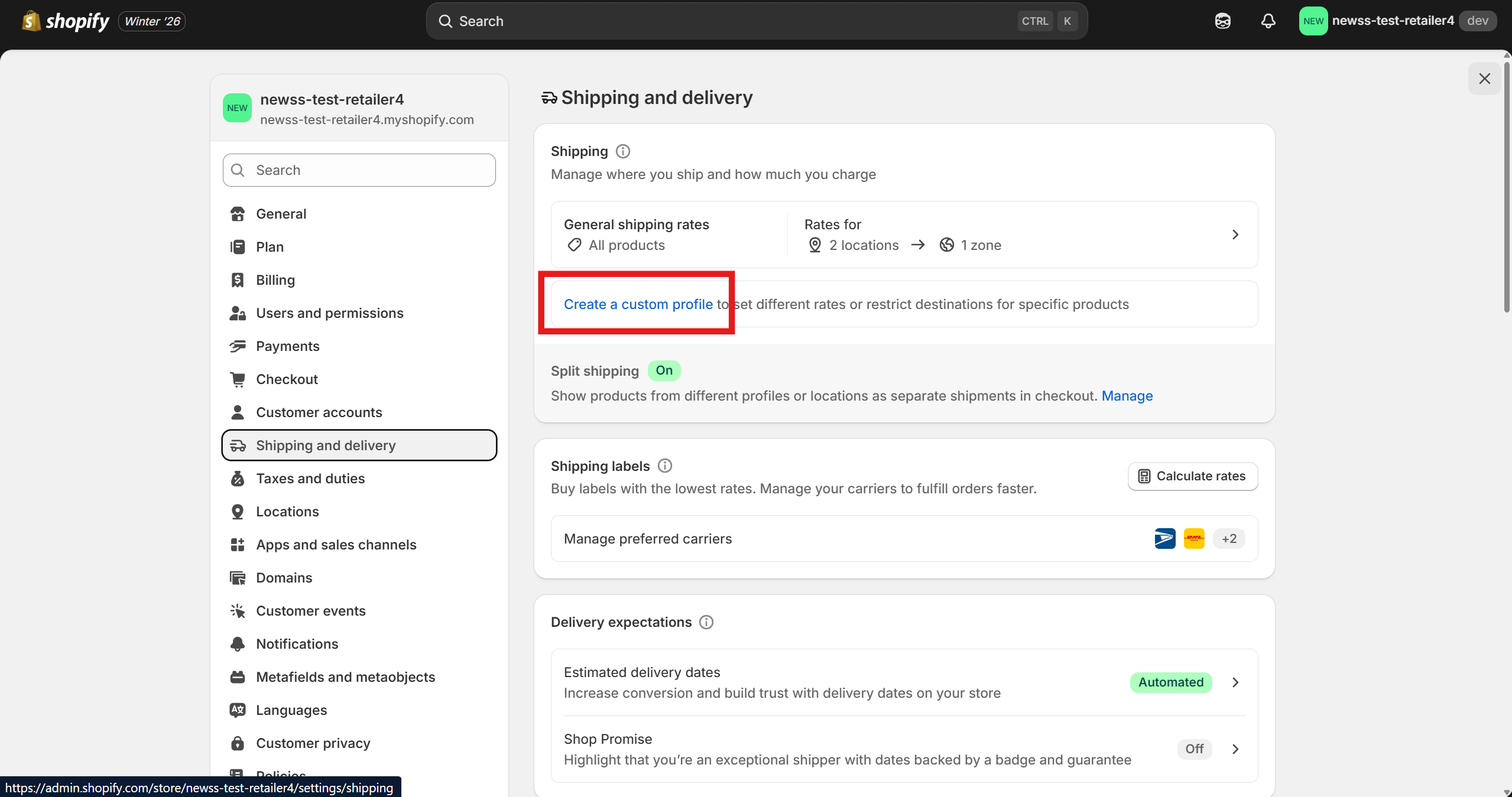 1. Go to "Settings" in Shopify, then "Shipping Rates" and select the Shipping Rate Profile to use for StockShare products (alternatively you can also create a new one and name it yourself).
