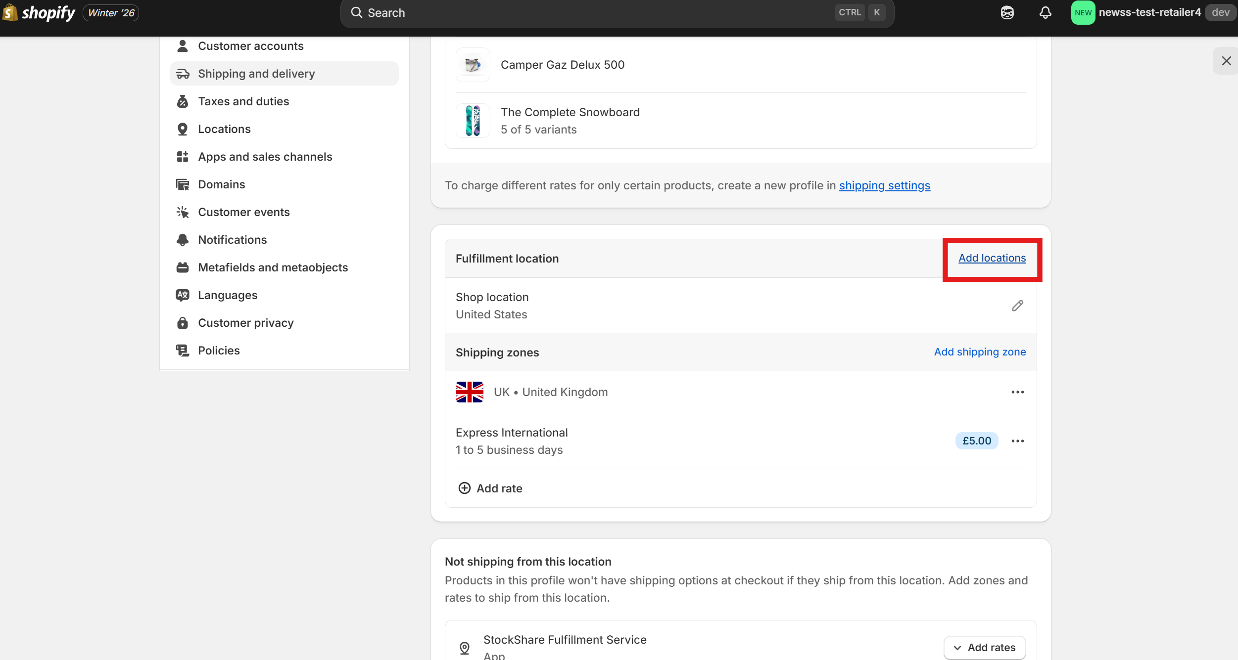 2. Scroll down to "Fulfilment location" and select "Add locations":