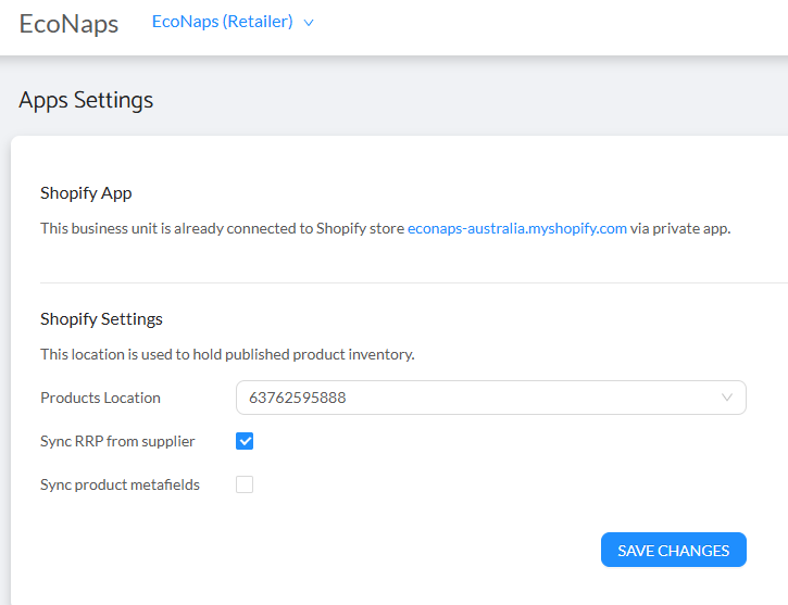 - Sync RRP from Supplier is activated to pass the new pricing to your Shopify Store. This can be found in the “Setting”/ “Apps” menu.